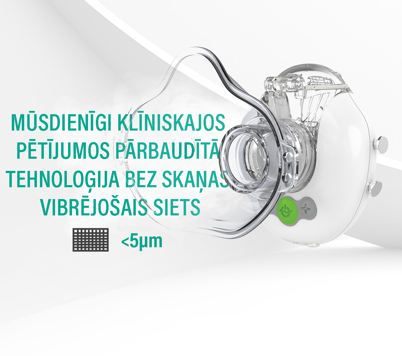 EVOLU NANO AIR MINI modernāko MESH tehnoloģiju. Pateicoties unikālajai MESH tehnoloģijai, nebulaizers izsmidzina medicīniskos šķidrumus, veidojot ideāli smalku miglu mērķtiecīgai zāļu piegādei skartajā zonā.