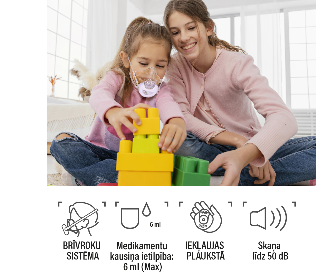 Vēl viena būtiska EVOLU nano AIR MINI priekšrocība ir tā inovatīvā konstrukcija ar silikona lentēm. Šo nebulaizeru piestiprina pie galvas, kas ārstēšanas laikā nodrošina lietotājam brīvas rokas. Tagad jūs varat ērti lasīt grāmatu savam bērnam, strādāt ar klēpjdatoru vai pat spēlēties ar rotaļlietām, nepārtraucot ārstēšanas procesu. Tas patiešām ir revolucionārs solis veselības aprūpē.