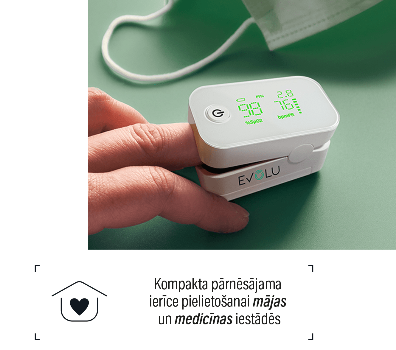 EVOLU PIRKSTA PULSA OKSIMETRS ir pārnēsājama ierīce, kas paredzēta cilvēka asiņu skābekļa piesātinājuma pakāpes (Sp02 piesātinājuma) noteikšanai ar neinvazīvu metodi, kā arī pulsa ātruma noteikšanai. Ierīce ir pielietojama mājās, medicīnas un sabiedriskās organizācijās, sporta medicīnā u.c.
